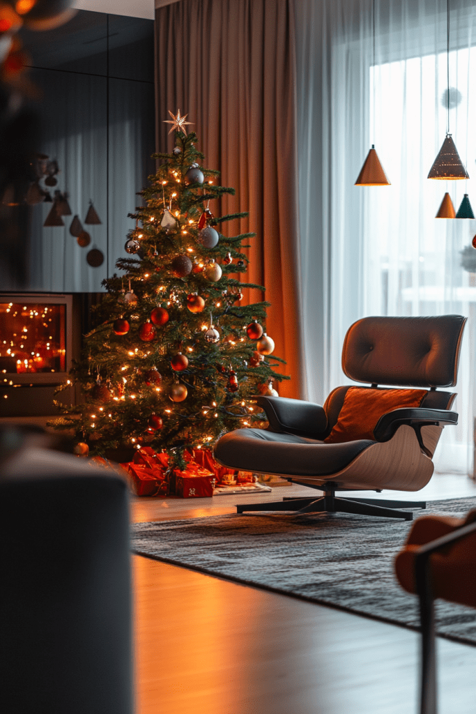 Transform your home into a festive wonderland! This cozy living room features a beautifully decorated Christmas tree adorned with lights, ornaments, and a star on top. The stylish lounge chair beside it creates a perfect nook for sipping hot cocoa. Embrace the holiday spirit and make every corner sparkle with warmth.
