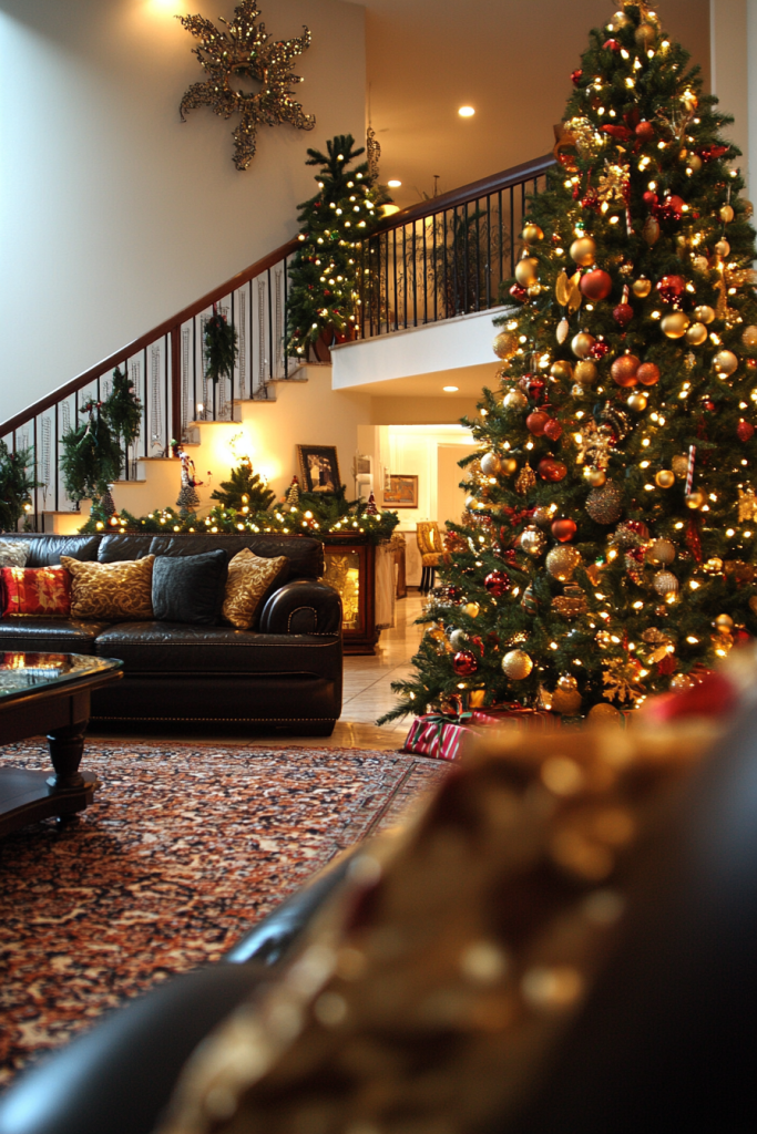 Create a warm and inviting holiday atmosphere with this beautifully decorated living room. Featuring a large Christmas tree adorned with twinkling lights and gold and red ornaments, this space exudes festive charm. The dark leather sectional sofa with patterned pillows adds a touch of comfort and style. The staircase in the background is beautifully decorated with garlands and lights, enhancing the festive ambiance. A large, ornate star-shaped decoration above the stairs completes the look, making this room perfect for celebrating the holiday season in style.