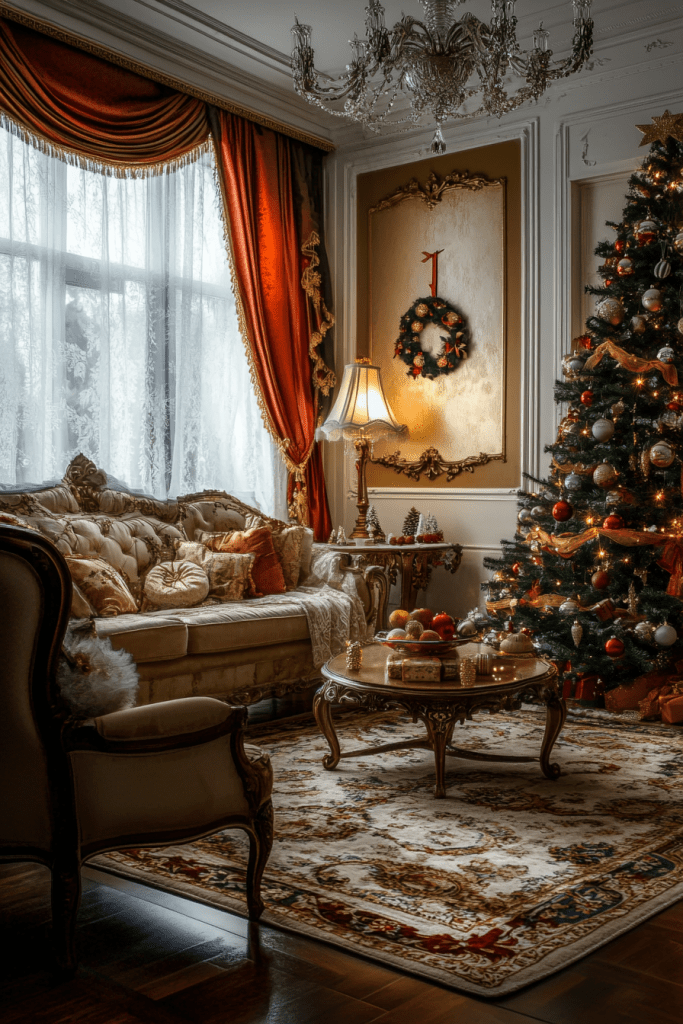 Immerse yourself in the opulence of this beautifully decorated living room, perfect for the holiday season. The focal point is a grand Christmas tree adorned with an array of ornaments, twinkling lights, and festive ribbons, creating a stunning visual impact. The elegant, vintage-style sofa with intricate carvings and plush cushions invites you to relax in comfort. A round wooden coffee table in front of the sofa displays a festive arrangement of Christmas baubles and small wrapped gifts, adding to the holiday cheer. To the right, a side table with a classic lamp and additional holiday decorations, such as pine cones and miniature trees, enhances the warm and inviting atmosphere. The room is softly illuminated by a chandelier and natural light filtering through lace curtains and rich, red drapes. A Christmas wreath on the wall completes the look, making this space the epitome of luxurious holiday decor.