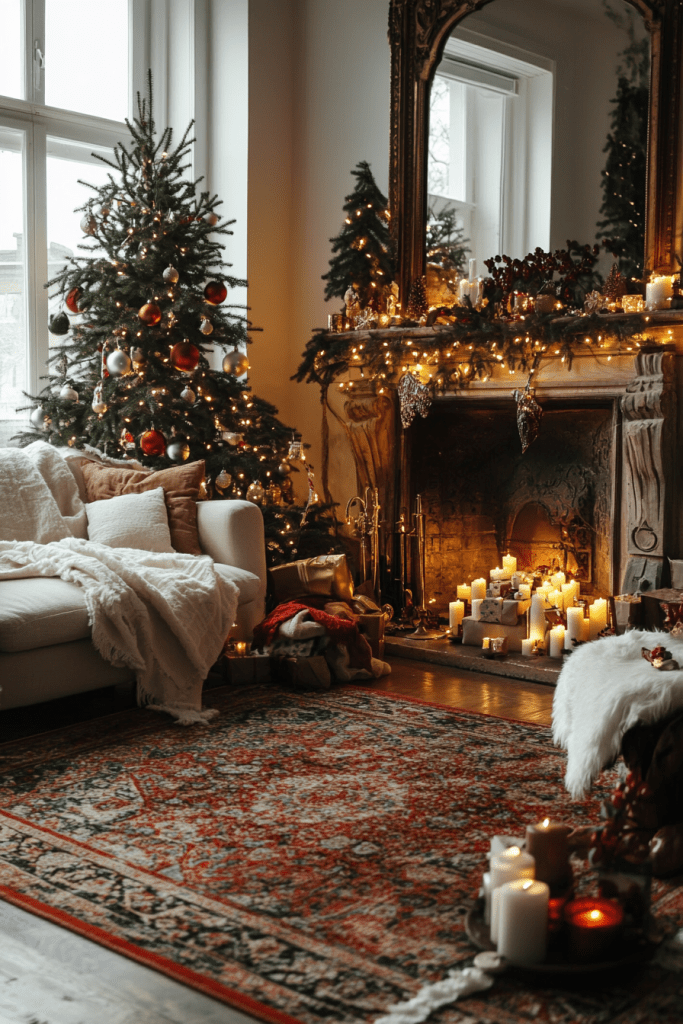 Create a warm and inviting holiday atmosphere with this elegantly decorated living room. The large Christmas tree is adorned with red, gold, and silver ornaments and lights, creating a festive and magical ambiance. The fireplace mantel is beautifully decorated with garlands, lights, and various Christmas decorations, adding to the charm of the room. Numerous lit candles placed on the mantel and inside the fireplace enhance the cozy and warm feel. A plush white sofa with pillows and a blanket invites relaxation. Wrapped presents near the tree and a richly patterned rug complete the festive scene. The large ornate mirror above the fireplace reflects the holiday decor, making the space feel even more enchanting. A tray with more candles on the floor in the foreground adds an extra touch of warmth and comfort.