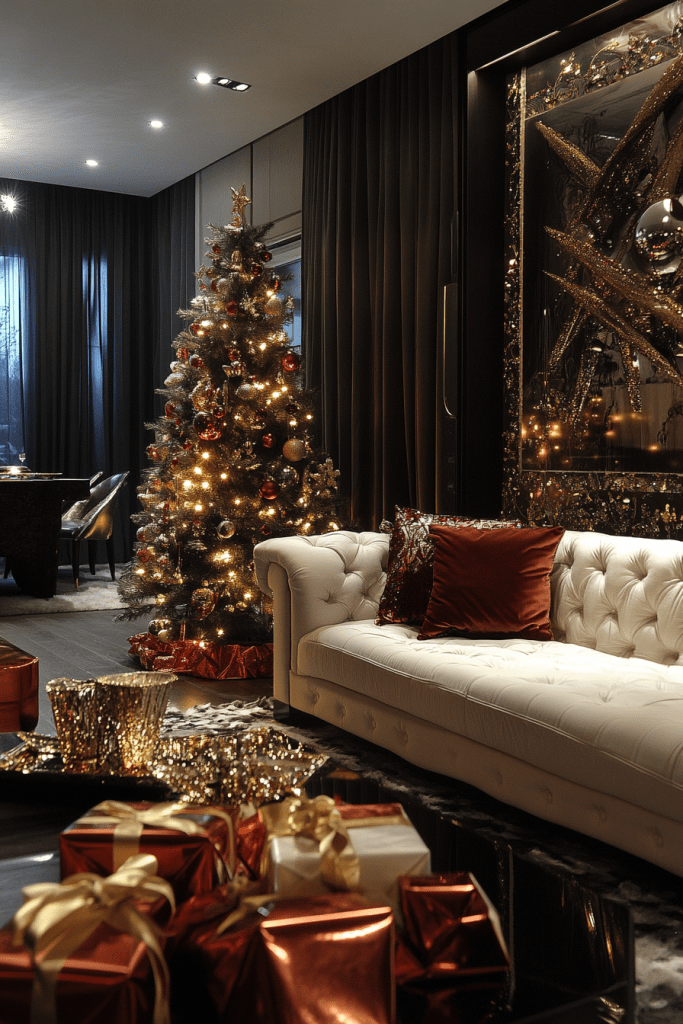 Create a warm and inviting holiday atmosphere with this beautifully decorated living room. The large Christmas tree is adorned with twinkling lights, ornaments, and a star on top, adding a touch of festive charm. The white tufted sofa with red and gold pillows complements the holiday decor perfectly. Wrapped presents in shiny red and gold wrapping paper with ribbons sit in front of the sofa, enhancing the festive ambiance. Decorative items on a table, including gold-colored candle holders, add elegance to the setting. This dimly lit room exudes a cozy and festive atmosphere, making it ideal for the holiday season.