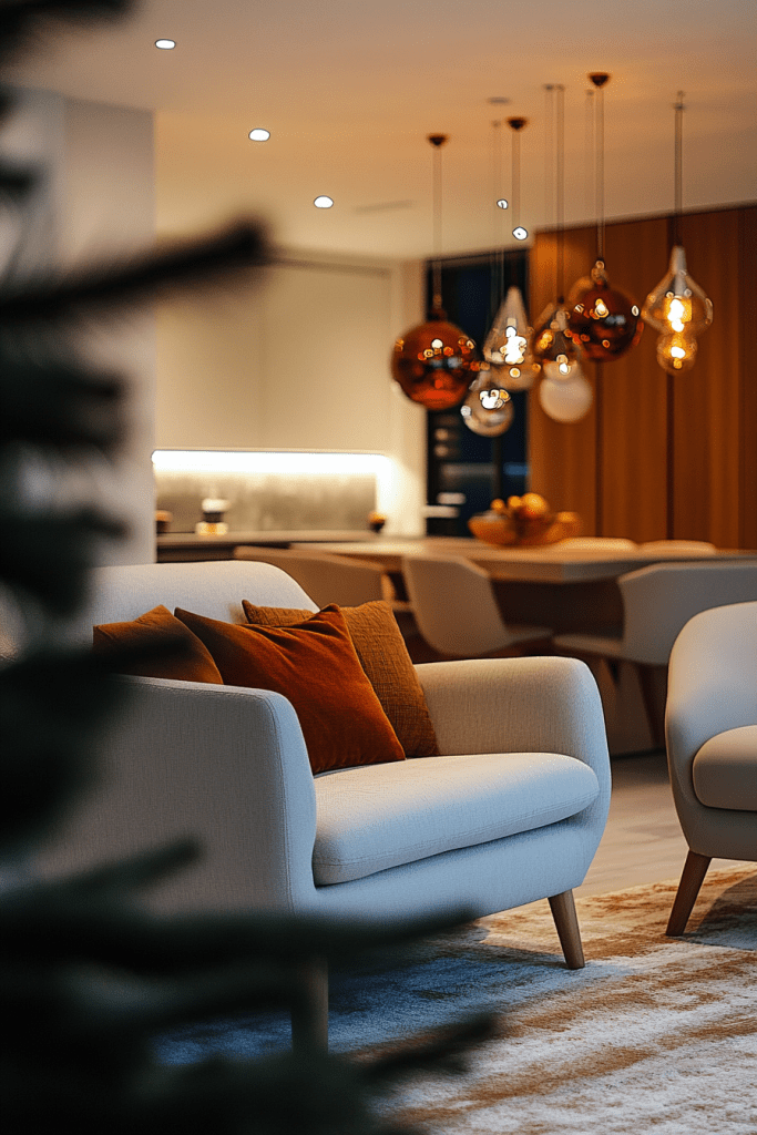 Experience the perfect blend of comfort and contemporary design in this stylish living room. The light-colored armchair with vibrant orange cushions adds a pop of color and coziness. The sophisticated dining area in the background features a set of hanging pendant lights with various shapes and finishes, creating a warm and inviting ambiance. The wooden elements and soft lighting enhance the overall contemporary and inviting feel of this space.