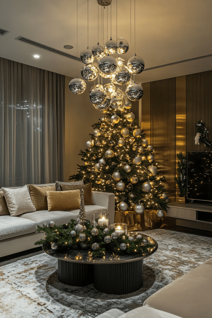 Step into a winter wonderland with this beautifully decorated living room. The focal point is a large, well-lit Christmas tree adorned with gold and silver ornaments and lights. In front of the tree, there’s a modern, round coffee table decorated with a festive arrangement of candles, greenery, and silver ornaments. The cozy white sectional sofa with gold and silver pillows complements the holiday decor perfectly. Above the coffee table, a striking chandelier made up of multiple reflective spherical lights adds a touch of elegance. The soft lighting and elegant decor enhance the warm and inviting ambiance, making this room perfect for the holiday season.