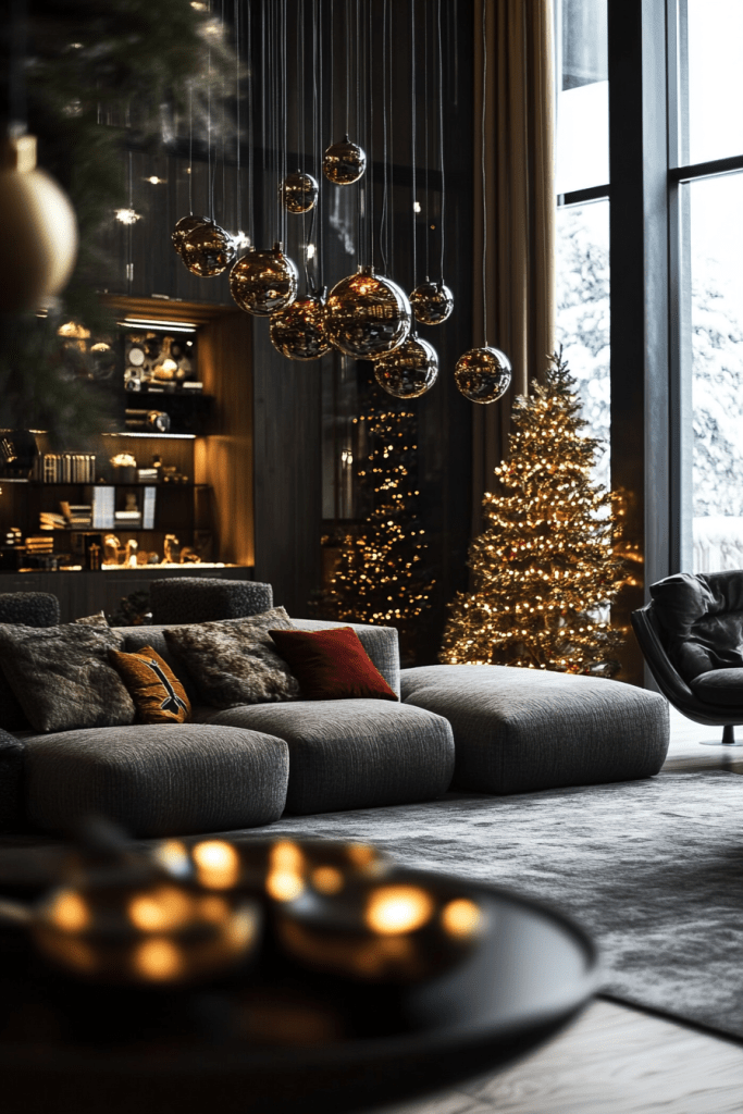 Create a warm and inviting holiday atmosphere with this elegantly decorated living room. Featuring a large Christmas tree adorned with twinkling lights and ornaments, this space exudes festive charm. The comfortable gray sectional sofa with various textured pillows invites relaxation. The cluster of metallic spherical pendant lights adds a modern touch, and the bookshelf with decorative pieces and books enhances the cozy ambiance. Large windows reveal a snowy outdoor scene, completing the festive look.