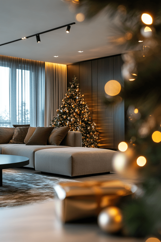 Create a warm and inviting holiday atmosphere with this elegantly decorated living room. Featuring a large Christmas tree adorned with twinkling lights and ornaments, this space exudes festive charm. The comfortable sectional sofa with various textured cushions invites relaxation. A round coffee table in the center adds a modern touch, and the soft rug enhances the cozy ambiance. Natural light filters through sheer curtains, and a cluster of wrapped gifts and ornaments in the foreground adds to the festive atmosphere. This setting is perfect for a cozy and elegant holiday season.