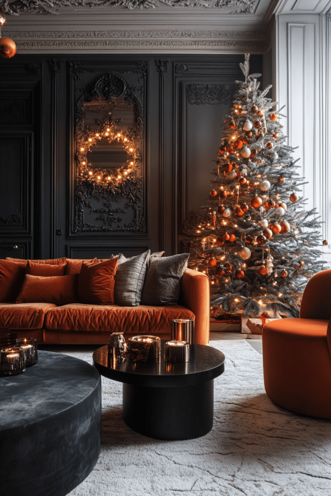 Create a warm and inviting holiday atmosphere with this elegantly decorated living room. Featuring a stunning Christmas tree adorned with orange and gold ornaments, twinkling lights, and a star topper, this space exudes festive charm. The cozy orange sofa, with its array of cushions in warm hues, invites you to relax and enjoy the holiday spirit. A black coffee table, adorned with candles and decorative items, adds a touch of sophistication. The intricately designed dark wall with a lighted wreath enhances the festive ambiance. This beautifully designed living room radiates holiday cheer and elegance, making it the perfect place to celebrate the season.