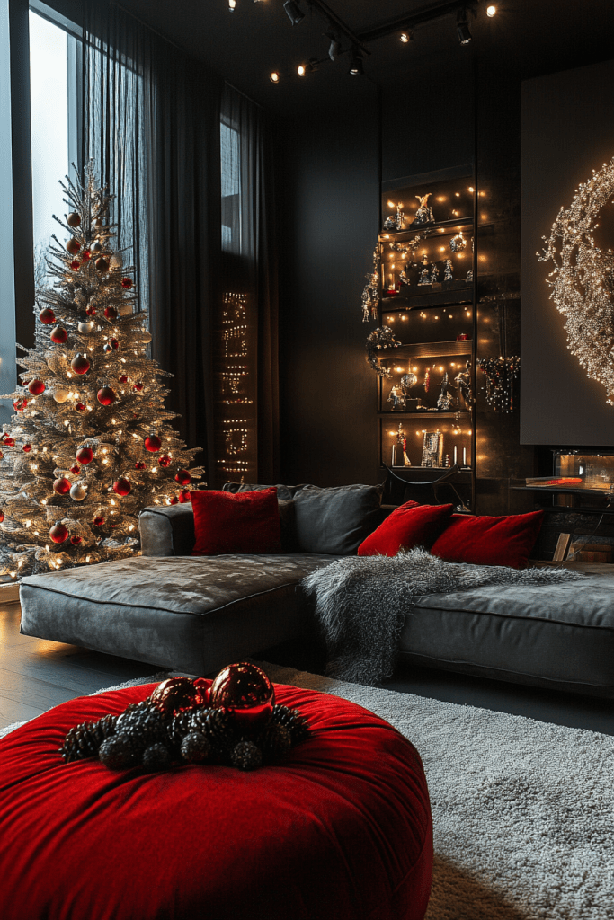 Create a warm and inviting holiday atmosphere with this beautifully decorated living room. Featuring a large Christmas tree adorned with lights, red and gold ornaments, and a star topper, this space exudes festive charm. The grey sectional sofa with red and grey pillows and a throw blanket invites you to relax and soak in the holiday spirit. The red ottoman, decorated with pinecones and ornaments, adds a touch of rustic warmth. The dark walls with shelves displaying various Christmas decorations and a large illuminated wreath enhance the festive ambiance. This cozy and inviting room is perfect for celebrating the holiday season with loved ones.