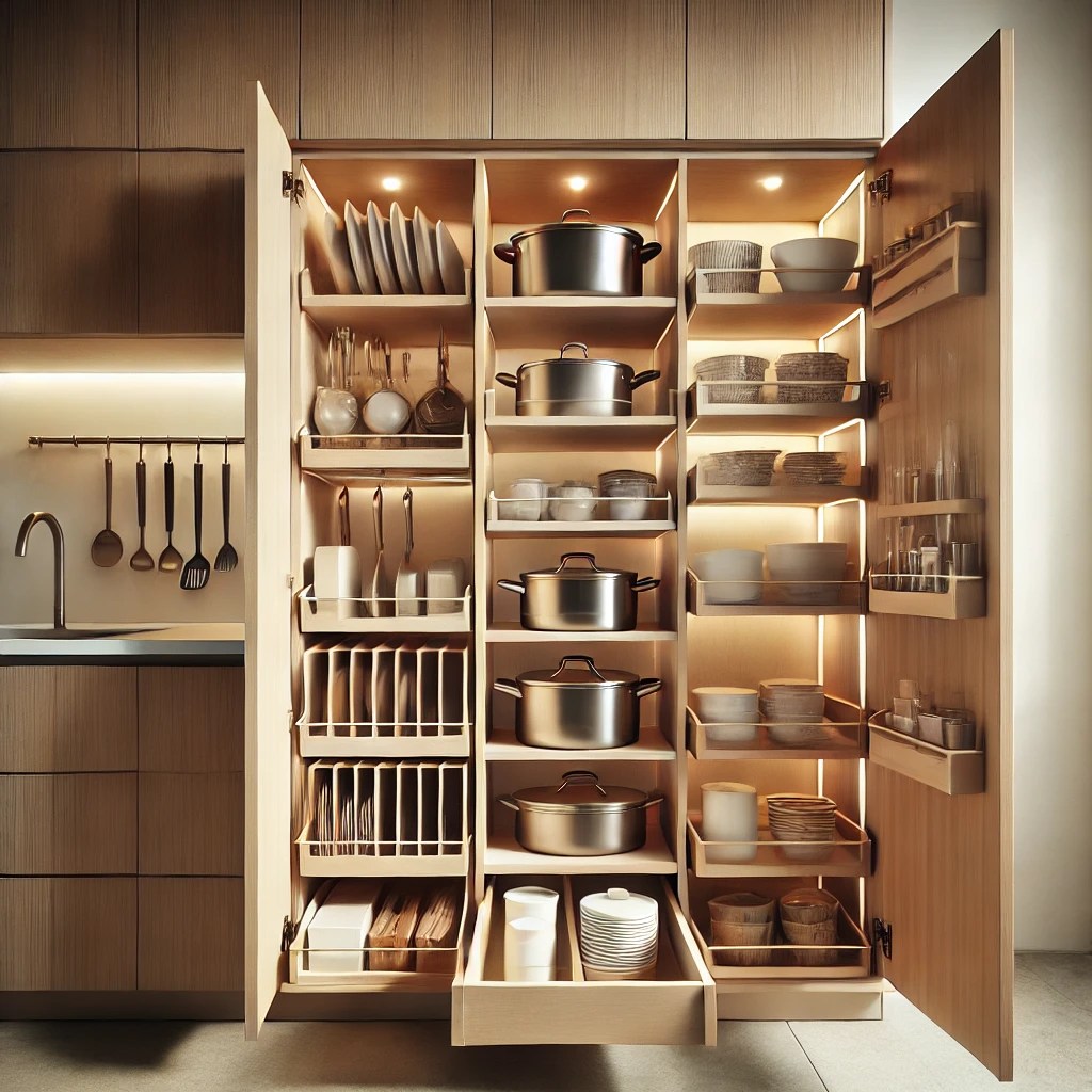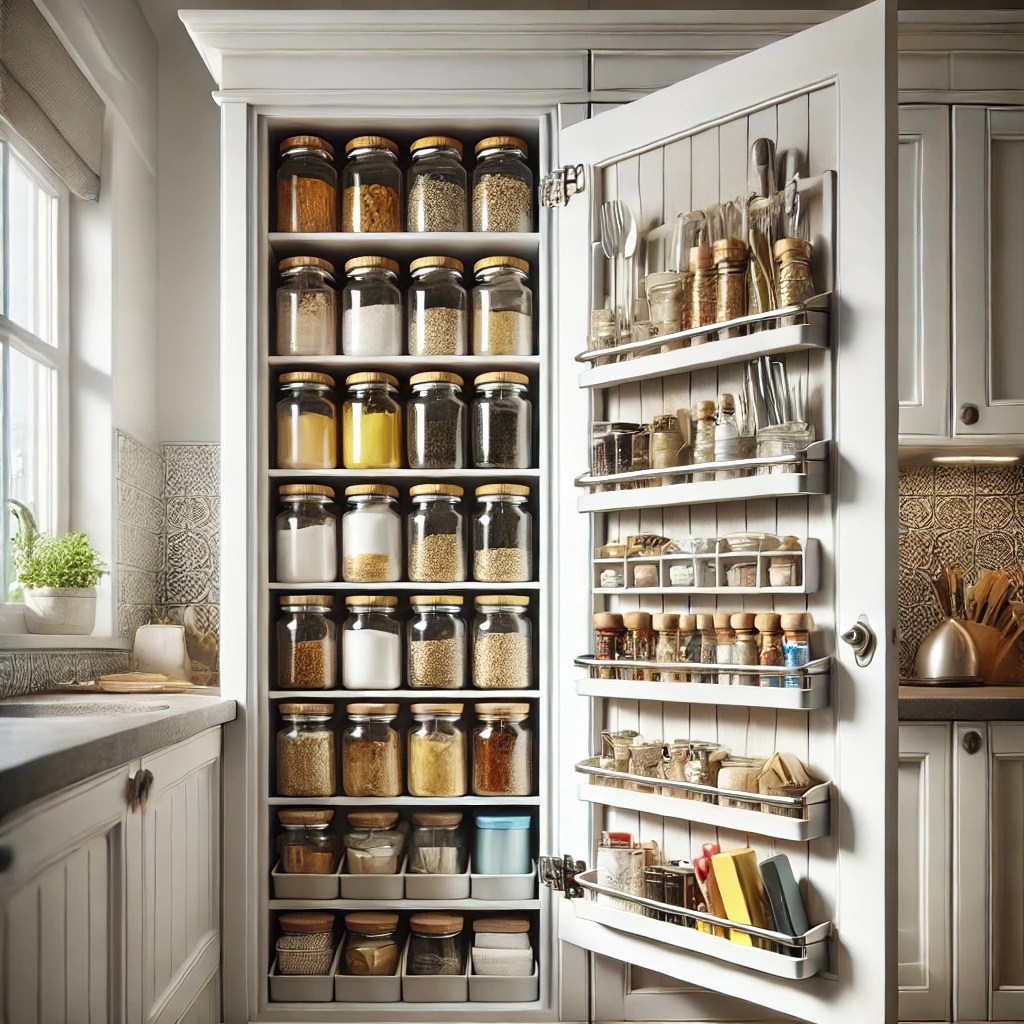 Use the back of your pantry or cabinet doors for extra storage. Over-the-door organizers are perfect for spices, baking sheets, or cleaning supplies.