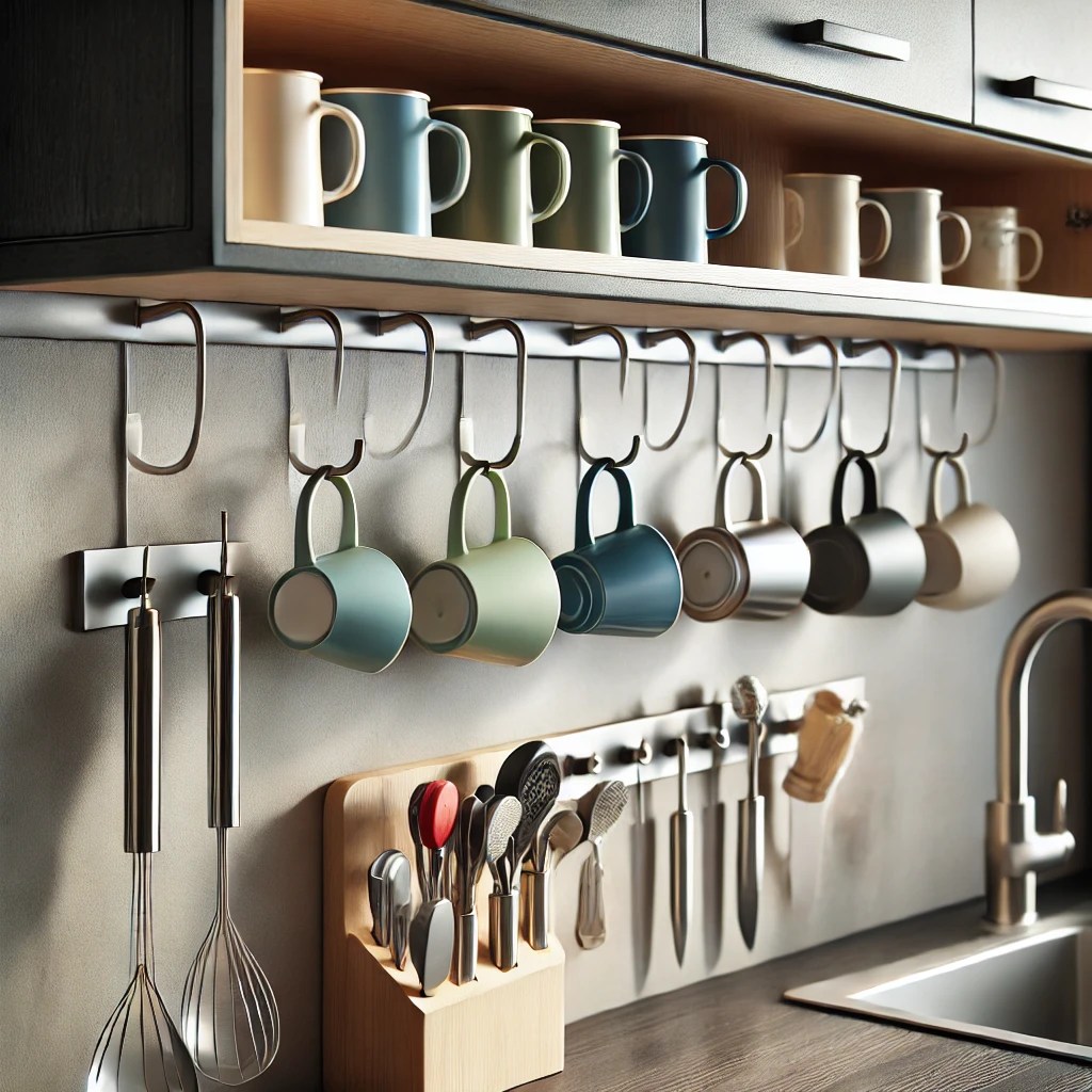 Attach hooks underneath cabinets or shelves to hang mugs, measuring cups, or small tools. This frees up shelf space and adds a cute visual element.