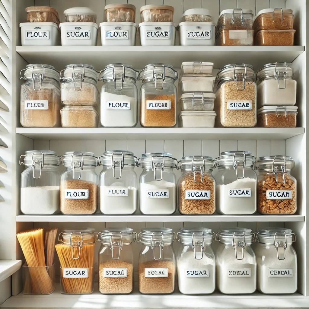Store pantry staples like flour, sugar, and cereal in clear, labeled containers. Not only does this look tidy, but it also makes it easy to see when you need a refill.